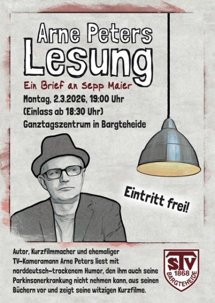 Wir laden Euch zu einer Lesung mit Arne Peters, einem Autor, Kurzfilmmacher und ehemaligen TV-Kameramann am Montag, 02.03.2026 zu um 19 Uhr ins GTZ Bargteheide ein.