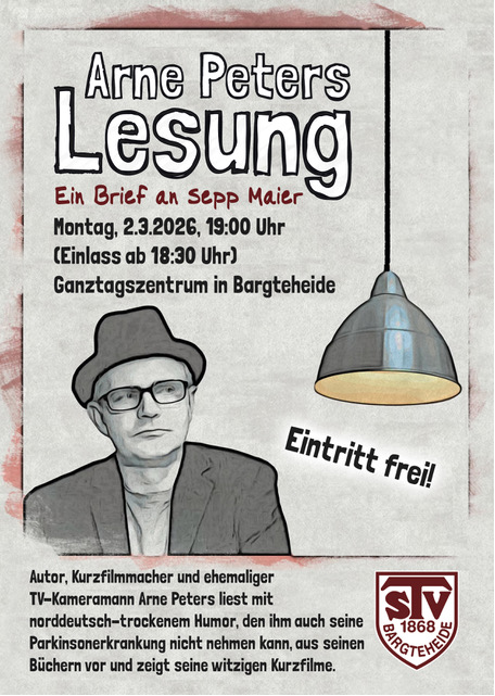 In der kurzweiligen Veranstaltung wird Arne Peters aus “Ein Brief an Sepp Maier” lesen und einige seiner norddeutsch-trockenen Kurzfilme zeigen. Der Eintritt ist frei.